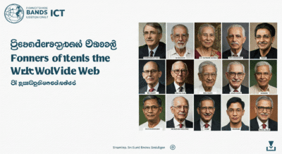 This high-resolution Sinhala-language educational banner introduces six of the most influential pioneers in the history of computing. Designed for Sri Lankan classrooms and ICT learning environments.